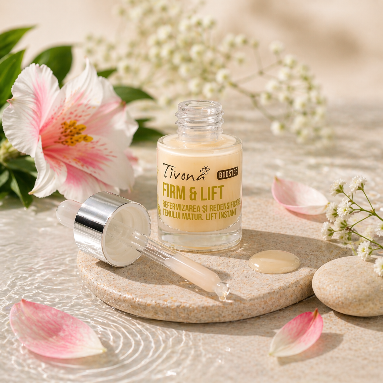 Înaintarea în vârstă, acțiunea factorilor de mediu și a celor genetici, expunerea excesivă la soare, alături de modificările hormonale pre- și post-menopauză determină transformări drastice la nivelul tenului, datorită alterării unor componente esențiale responsabile de menținerea stabilității mecanice și fermității pielii. Serul concentrat FIRM & LIFT conține o combinație de ingrediente vegetale active al căror mod de acțiune vizează menținerea în parametri optimi a acestor componente, restaurând densitatea, vitalitatea și luminozitatea tenului matur, ameliorând aspectul ridurilor și conferind un aspect revigorat, tonificat și întinerit.