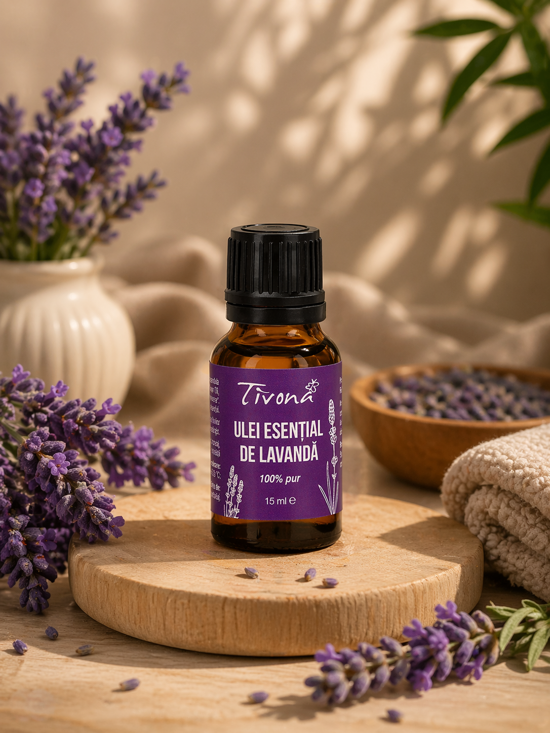 Ulei esenţial 100% natural, obţinut prin distilarea cu vapori a inflorescenţelor de Lavandula angustifolia, provenite din agricultura ecologică, fără adaos de substanţe sintetice, solvenţi sau alcool.